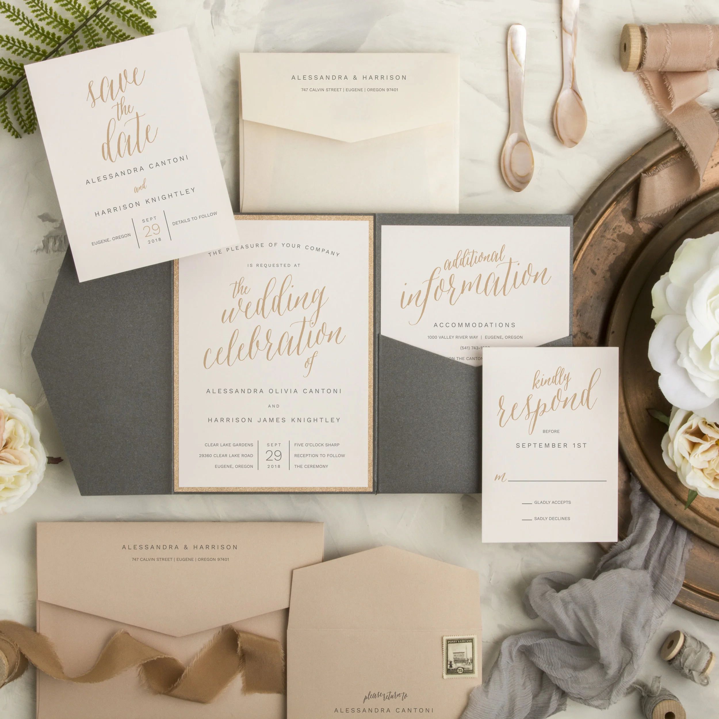 This modern, neutral color palette and script detail makes this wedding suite shine!