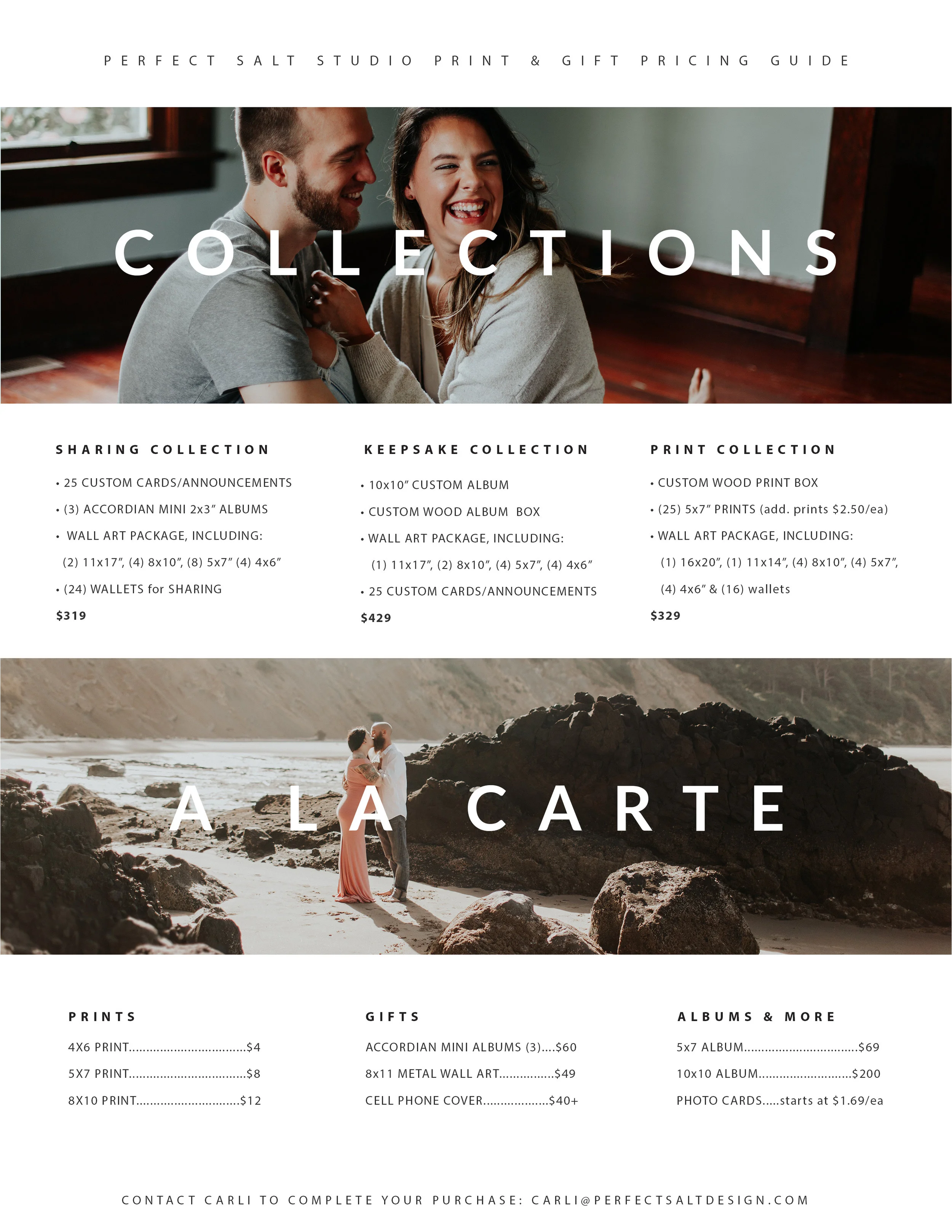 Whether you want to display your photos at home, preserve them for generations to come, or share with friends and family, my customized collections provide my most popular, quality photo products at a discount from the a-la-carte price. Collections can be combined with a-la-carte items, please no substitutions.